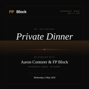 A private dinner hosted by Aaron Contorer, Founder and Chair of FP Block, taking place on May 6, 2026, during Consensus Miami. The event runs from 7:00 to 10:00 PM and is designed for a small, curated group. The format is intentionally intimate, bringing together founders, fund managers, and institutional builders focused on on-chain finance. Attendance is limited, making it suited for those looking for substantive conversation rather than a large networking event.