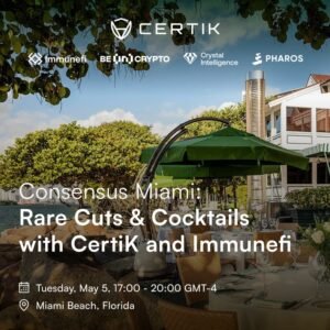 Consensus Miami: Rare Cuts & Cocktails is an invite-only evening event taking place on May 5, 2026, from 5–8 PM in Miami Beach. It is co-hosted by CertiK, Immunefi, Crystal Intelligence, BeInCrypto, and Pharos, and held at a steakhouse venue near the Miami Beach Convention Center. The evening includes a panel discussion featuring CertiK CEO Ronghui Gu, Immunefi CEO Mitchell Amador, and Crystal Intelligence’s Dominic Schaffer, moderated by Jackson Alton Hinkle. Topics center on blockchain security, onchain intelligence, DeFi, payments, and institutional use cases. The format combines the panel with curated networking, cocktails, and dinner, targeting founders, security researchers, and builders working on Web3 infrastructure.